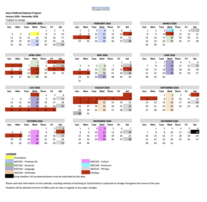 Montessori Teachers College does not guarantee admission or successful completion of the diploma program offered.
