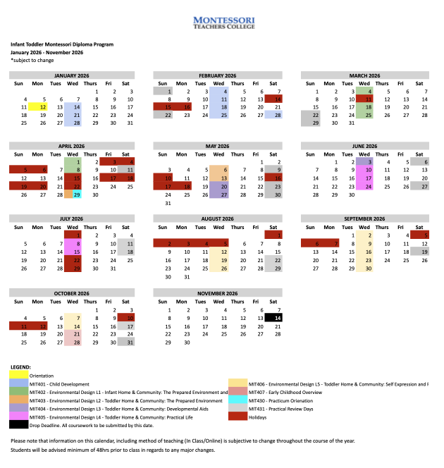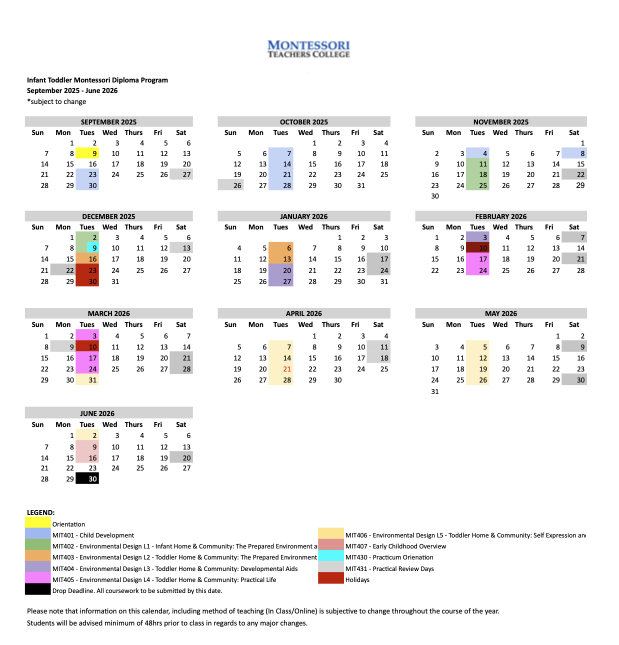 Montessori Teachers College does not guarantee admission or successful completion of the diploma program offered.