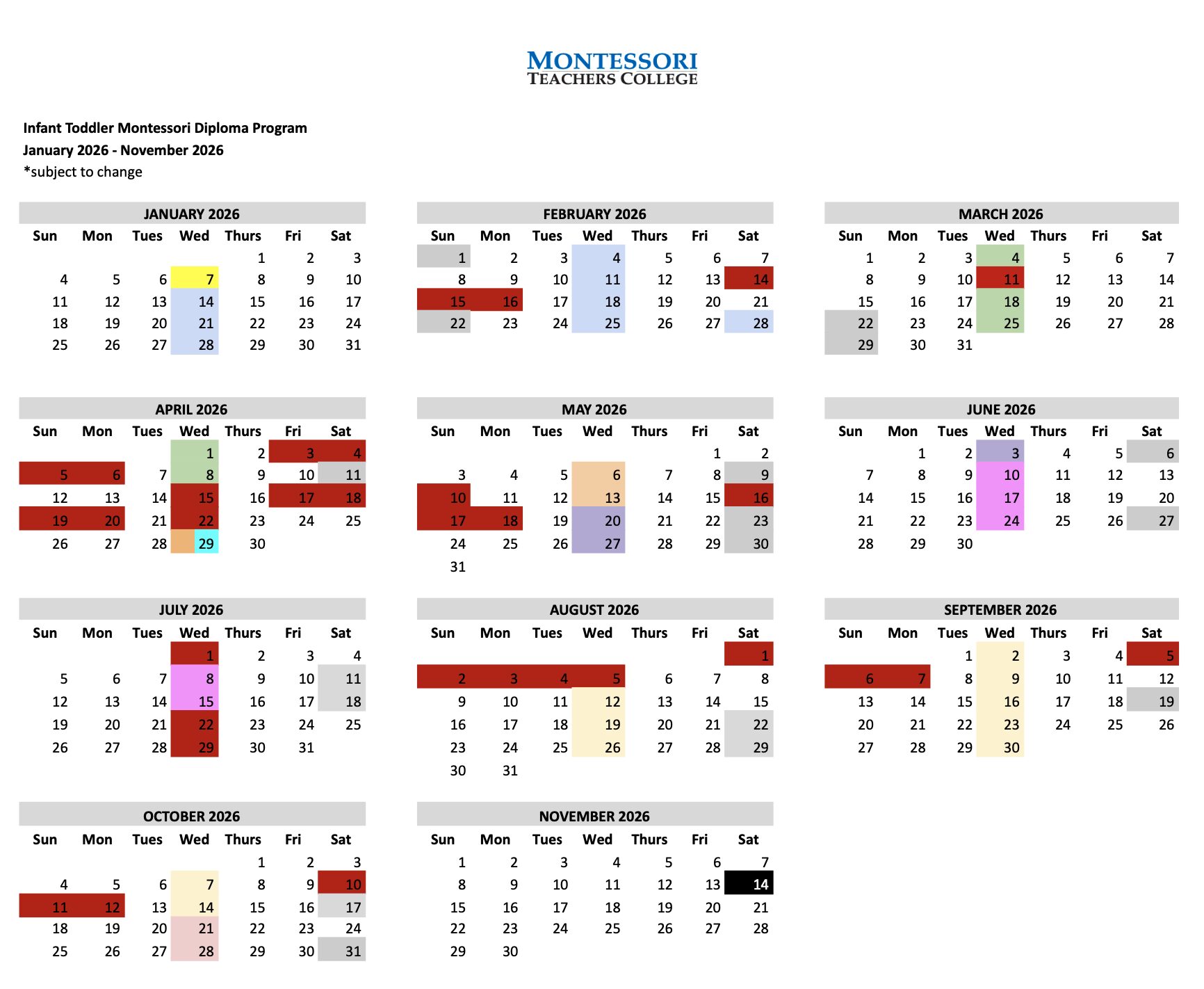 This skills and knowledge-based MACTE accredited Infant Toddler Montessori Diploma Program is geared towards adult learners who are working or plan to work full-time in a Montessori School environment. Our highly qualified faculty, advanced curriculum and blended (online and in-person) approach offers unparalleled learning opportunities for our adult learners. Graduates from our programs become problem solvers, innovators and resourceful Montessori educational guides for children.