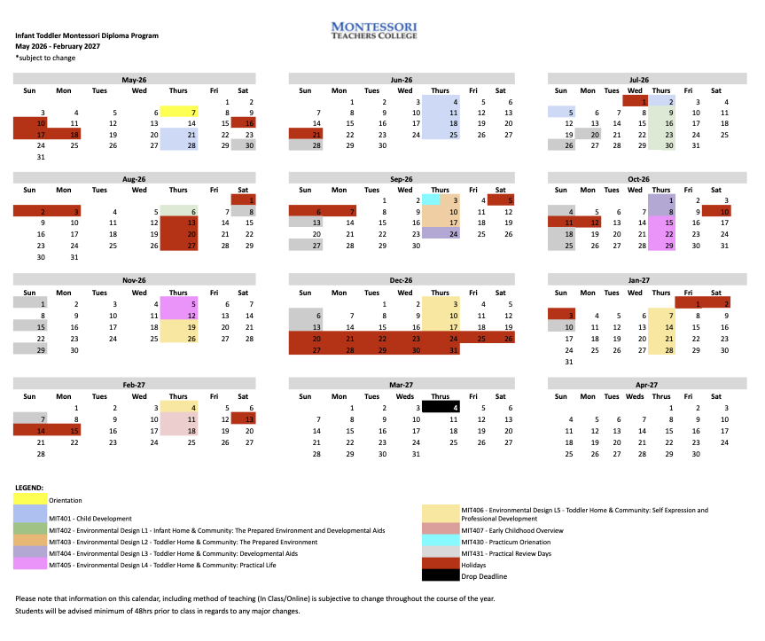 The Canada-Wide Infant Toddler Montessori Diploma Program has designated intake start dates annually in May and September.